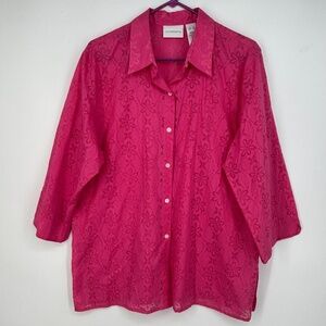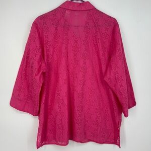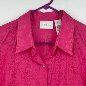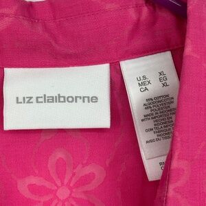 Liz Claiborne Womens XL Button Front Tunic Top Pink Sheer Floral 3/4 Sleeves