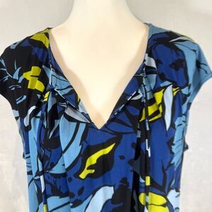Beautiful shades of blue with some mix of lime green. Vneck with ties. Short cap sleeves. Very starchy material. EUC