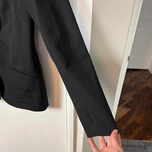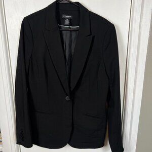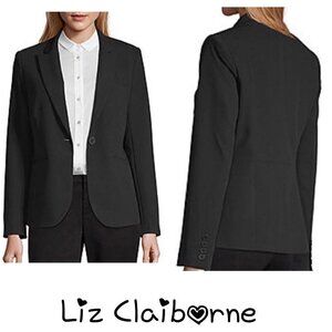 Liz Claiborne Career. Black single button closure blazer. Lined. Faux side pockets. Faux buttons at sleeves. 62% polyester 33% rayon 5% spandex. Lining 100% polyester