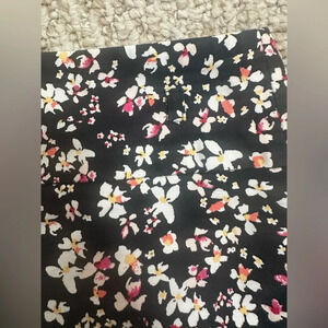 This elegant pencil skirt by Liz Claiborne showcases a delicate white and pink floral pattern on a dark background. It is perfect for casual or work settings. Its knee-length design and fitted silhouette offer a sophisticated and modern look, making it a versatile addition to any wardrobe. It can be worn with a belt.