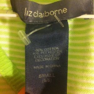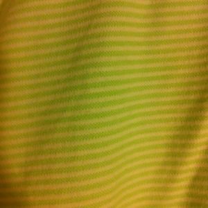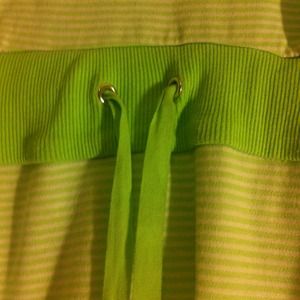 This dress has green and white alternating stripes going vertical throughout the dress. Has a thick green strap at waist with ties to accommodate different sizes. Says 6/8 but fits more like a 3/4. Never been worn.