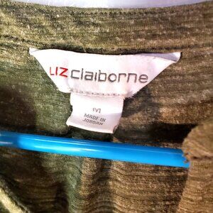 Liz Claiborne green tee size M with roushing around the neck. in fair condition very lightweight perfect for warmer weather.