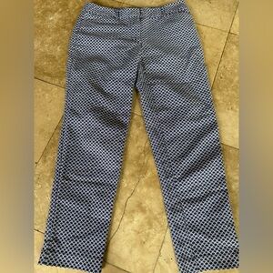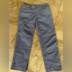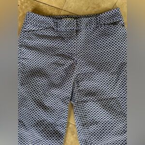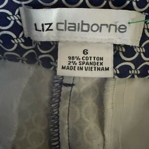 Liz Claiborne ladies ankle pants “EMMA” size 6 excellent condition zip and hook closure in front to front pockets two back pockets, belt, loops, blue and white geometrical design 98% cotton. These pants are perfect for the summer.