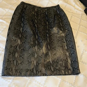 Great leather grey and black snakeskin print leather skirt. Quality Liz Claiborne pencil skirt. Good used condition but note last picture a couple of loose stitches at the split , could easily be fixed but I wanted to show as is. 30’ waist and 25.5 length.