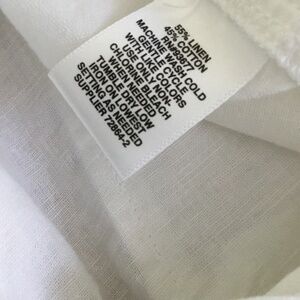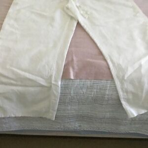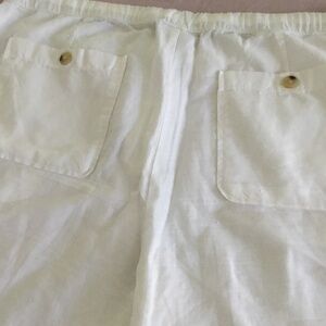 White linen blend pants size medium (see tape measurement) hips 46" around, (23 across) - length 35" side pockets - not lined but not see-through either. Drawstring adjustable waist. back pockets with button detail. washable...