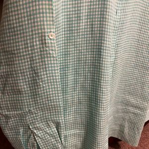 Liz Claiborne long sleeve button up shirt, size Small, aqua and white checked, sleeves can be rolled up and buttoned with the sash, smoke free home, excellent condition