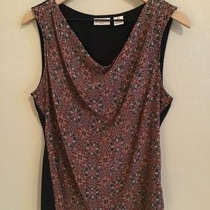 Multicolor, geometric patterned top, lined, cowl neck, sleeveless, navy blue back/solid, tank