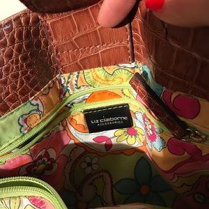 Brown alligator pattern Liz Claiborne pocketbook and wallet with small make up bag. very colorful print inside with pockets and snap closure. small mark on the bottom of the bag