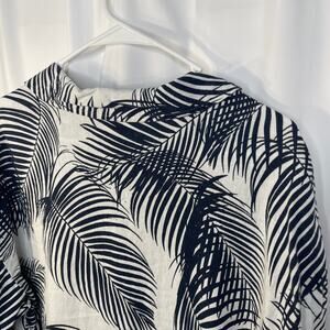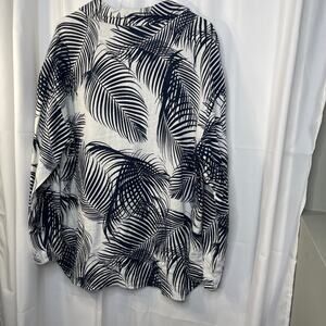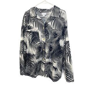 Liz Claiborne women's size Large overzied blouse shirt tunic top button down LINEN BLEND up black white tropical print oversized rounded hem