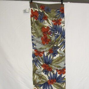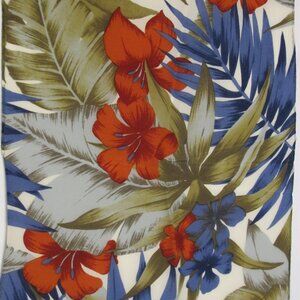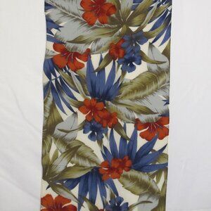 Liz Claiborne silk scarf with tropical pattern of palm leaves in light blue and olive green and navy blue with brick red flowers on a white background. Has been dry cleaned. 11” * 51”
