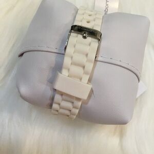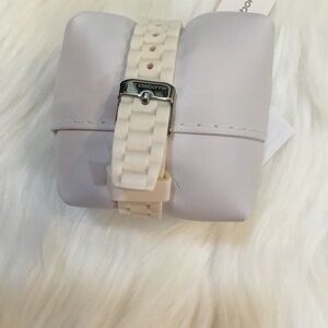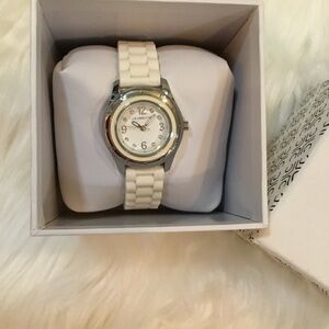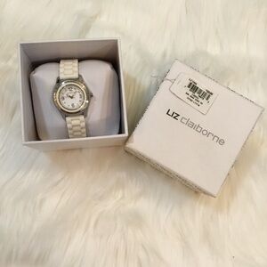 Liz Claiborne silver and white watch watch does need a battery/ band is a rubbery type material has been worn no major flaws just minor wear
