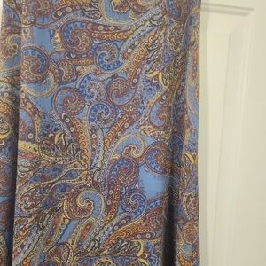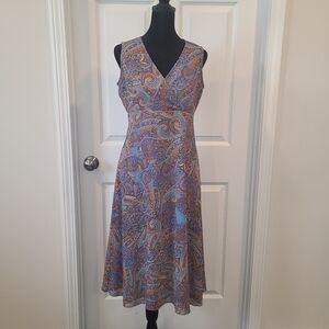 Empire powder blue and paisley print dress size 4 petite. There is a cute and different hemline on this chafaune like material. {Box4}