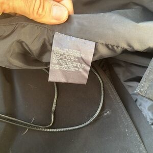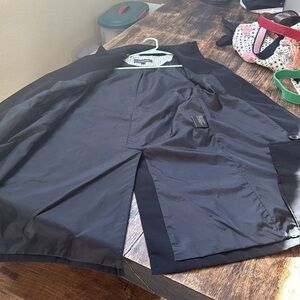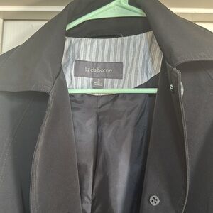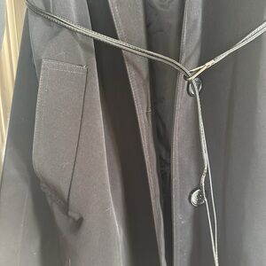 A classic trench coat in solid black color with a knee-length design and a wrap-style closure.