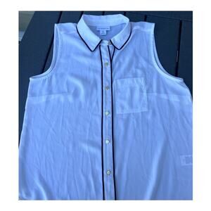 Liz Claiborne white sleeveless button down blouse, with black accent trim.    Has gold buttons and a collar.