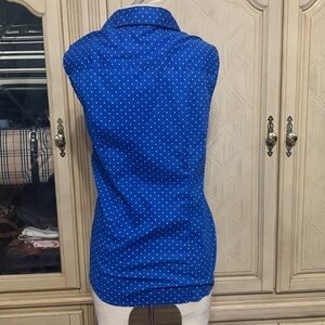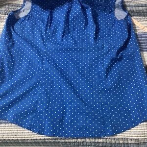 Cute polkadot, blue and white stretch. Top sleeveless button closure collar has Hilow appeal meaning shorter in the front and a little longer in the back with tapered darts down the back.