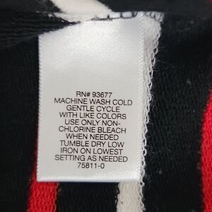 A rayon spandex blend soft stretchy casual top by Liz Claiborne in black, red, and white striped print with a round neckline, offset black colored cuffs, and a scalloped hemline. Great pre-owned condition.