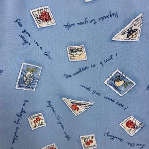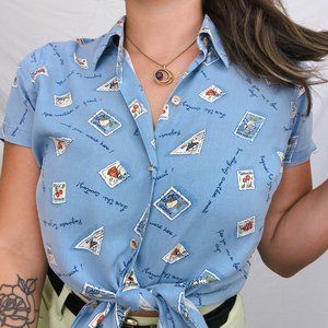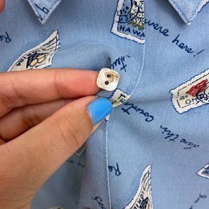 I'm in love with this vintage 100% silk beauty, featuring an all over print on a pastel blue background of stamps and written notes. The texture is super soft and has little square buttons.