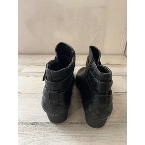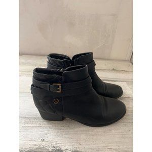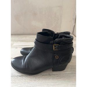 Liz Claiborne woman's black side zip ankle boots with decorative buckle. Heels measure approximately 2.5". Good pre-owned condition.
