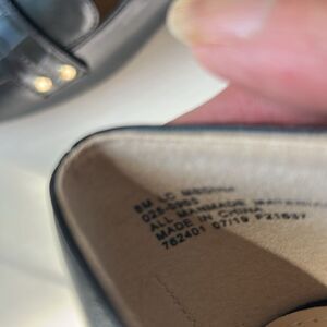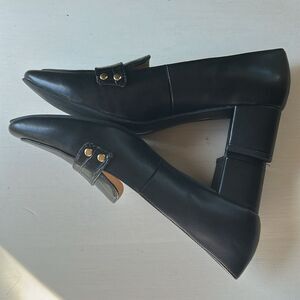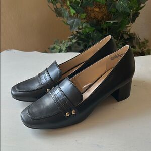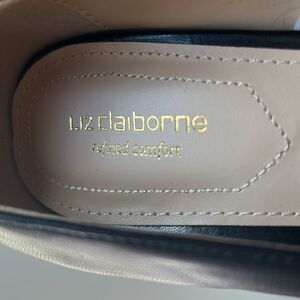 These Liz Claiborne feature a sleek design with a modern block heel, offering a perfect blend of style and comfort. The smooth vegan leather finish and decorative metal detail on the vamp add a touch of elegance, making them ideal for both professional and casual settings. With a slightly squared-off toe box, these shoes provide a clean and contemporary look.