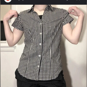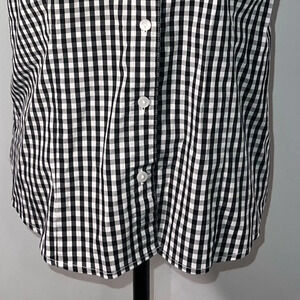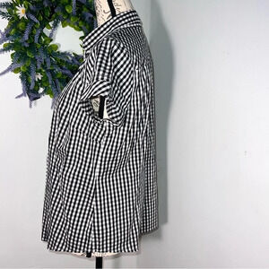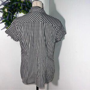Liz Claiborne,PL, short sleeve button front gingham, black white check print stretchy blouse