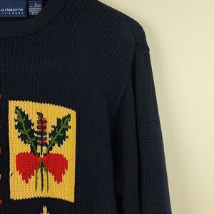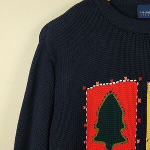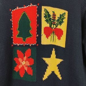 Liz Claiborne LizSport Chunky Knit Long Sleeve Cotton Holiday Sweater in Navy.  This pullover sweater features a Christmas Tree, Poinsettia, Star, and Greenery tied with a red bow on the front. The collar, cuffs, and hem have a tighter knit trim.  100% cotton.  Size Medium.