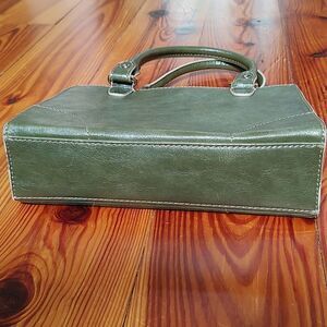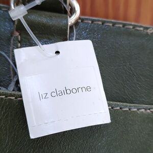 NWT Vintage Liz Claiborne Olive Green 2-Handled Structured Handbag with a Bow. Magnetic flap closure on top. 1 exterior slide pocket and 1 interior zipper pocket and 2 smaller slide pockets. Lavender fabric interior lining. Stitching along all the seams and at the bottom corners. Gorgeous handbag that looks like leather but is actually made of PVC.