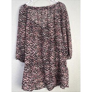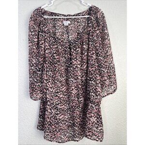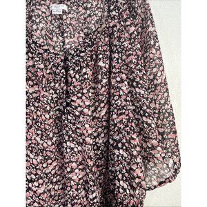 Liz Claibrone Top Sz 3X Black Pink Floral Flutter Sleeve Tunic Smocked Chiffon