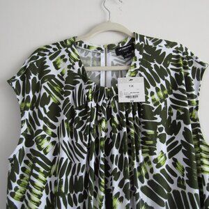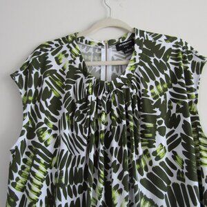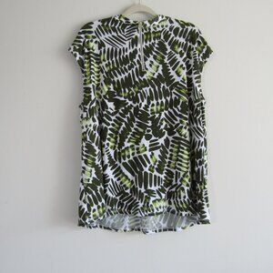 Liz Clairborne Career women's top - leaf printed, stretchy, sleeveless, front pleated accent and back 1/4 zipper closure. Green and white.