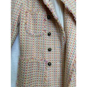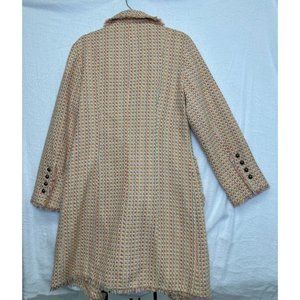 Vintage 1990’s, woman’s, size medium, long, pink, tweed coat made by Liz Claiborne. It is a knee-length, light to medium weight, completely lined, classically styled coat made of 100% polyester and directions say to dry clean only. It is made with a textured, woven fabric in tones of pink, peach, aqua and yellow thread/yarn. This is a double-breasted coat with a large notched collar and 4 patch pockets which are trimmed with self-fringe as well as all edges of the coat.