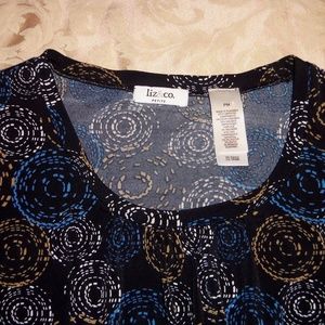 Very classy black top with blue and taupe swirls, circles. 95% polyester, 5% spandex.