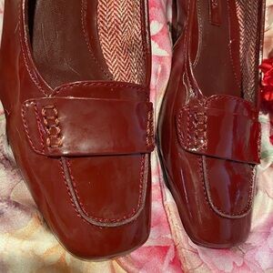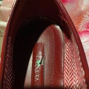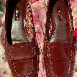 Burgundy shiny faux leather flats. Has one flaw on insole. Otherwise excellent condition. No sign of wear on bottom.