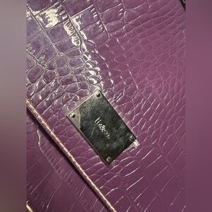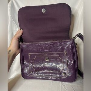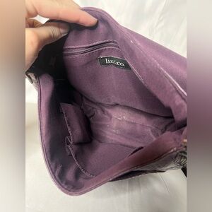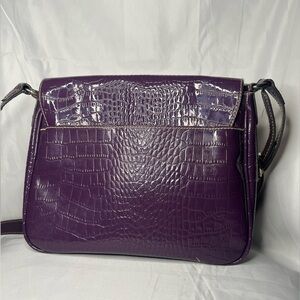 Liz & Co Purple Faux Crocodile Purse. A true purple, shiny faux crocodile style fabric. Snap flap closure with a pocket in the middle. Pocket in the back. Zipper pocket on the interior. Mostly clean interior. Excellent condition.
