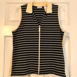 Liz&Co Sleeveless collared tank zipper in front. It is black with white stripes and a yellow collar and outline. Size is PXL. In excellent, pre-loved condition.