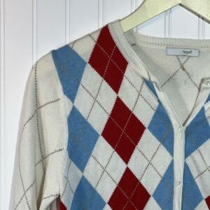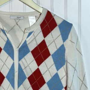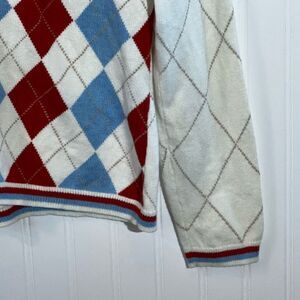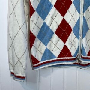 Liz Golf Button Down Sweater Women Medium White Blue Rust Argyle CottageCore