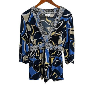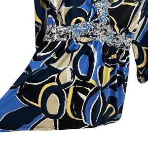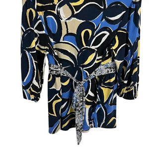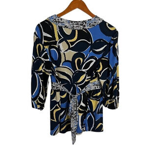 Liz Lange Maternity Blue Yellow Abstract Blouse XXL Waist Tie Draped Neck Top
