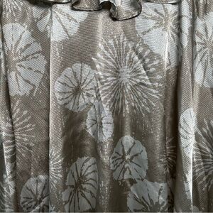Gently used Liz Lange Maternity blouse in a flattering flowy fit. Features a champagne beige background with a white floral burst print, soft and lightweight polyester fabric, and a ruffled detail at the neckline.