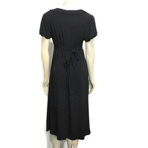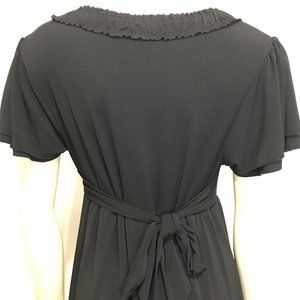 Empire waist with ruffles along v-neck, below knee-length, tie-back