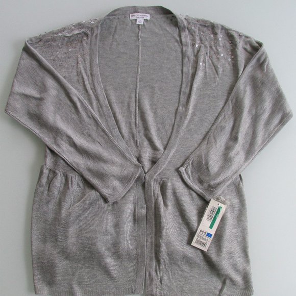 Description: Up for sale is a Liz Maternity (NWT) women's cardigan sweater. The size is large. The color is heather gray. It is made of 100% acrylic lightweight knit fabric. It has a single hook & eye closure with a tie. It features sequins on the shoulders. It has a $29.99 ticket attached.