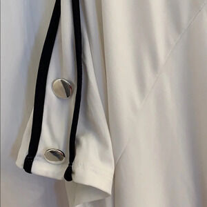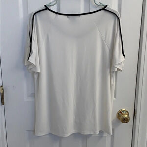 Beautiful blouse with front twist tie. Buttons accent both sleeves with a black trim. Excellent condition.