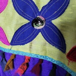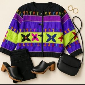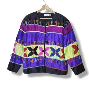 Statement Liz & Me jacket in a vibrant silk-blend with strip-pieced panels, floral appliqué/embroidery, and toggle buttons.