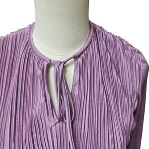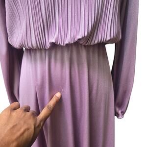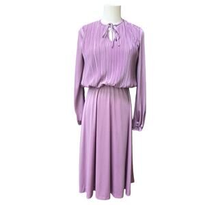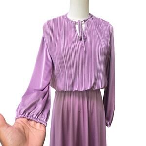 Liz Petites Inc. Womens Vintage 70s Boho Chic Shimmery Lavender Disco Midi Dress S/M Pleated Bodice Tie Neckline Long Sleeve