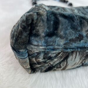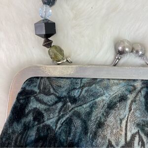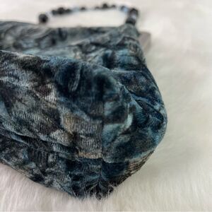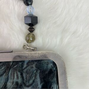 Liz Soto small evening bag. Blue, gray, and black fabric with a beaded handle. Interior slip pocket. Wear to metal, as shown in photos.