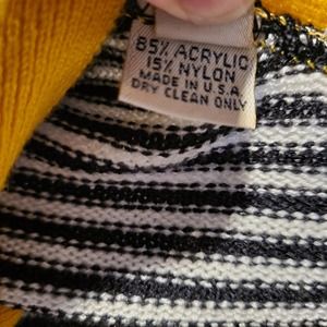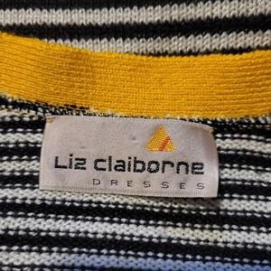 this is just an awesome two piece suit. black and white stripes. the jacket has golden yellow highlights around edging. very low v neckline with 3 buttons at the bottom hemline. the jacket does show a little fuzziness but I see nothing else wrong with the jacket. the skirt is going to go the knees. the waist is elastic so it does have a little wiggle room. the liz tag in the skirt is hanging on by one corner of sewing. but the tag is there just curling up. the skirt is pencil style and pretty straight. found no issues but some fuzziness like the jacket. for its age it's held up really well. smoke free home and pet friendly home. since this is vintage please check the measurements as stuff made many years ago is different from our sizes. this does have some weight to it so be aware it isn't light weight.
