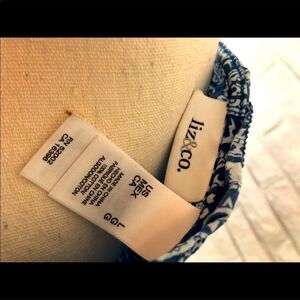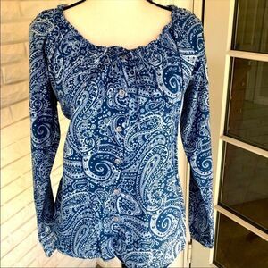 Very Cute Blue Blouse by Liz & co. Eye catching pattern and comfy cotton fabric will make this one of your favorite new pieces! The draw string neckline adds a fun flair to this top. Perfect for a casual Spring day. Will go great with jeans!