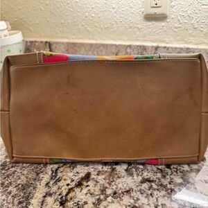Add a bold pop of vintage-inspired charm to your look with this Liz Claiborne tote bag. The canvas body features a vibrant fruit and floral print on a blue background, paired with tan faux leather trim and rolled handles. Spacious and practical, it’s perfect as a carryall, work tote, or weekend bag.