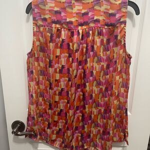 Vibrant sleeveless blouse. Features a multicolor abstract pattern. Lightweight and stylish.