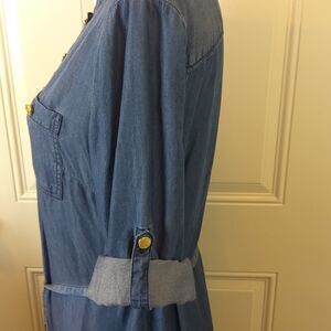 Liz Claiborne 100% Lyocell blue chambray gold button dress with two breast pockets, self tie belt, and side vents.
