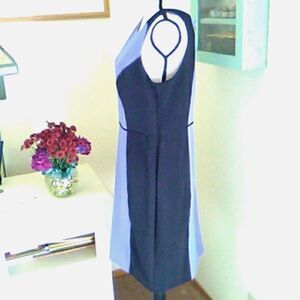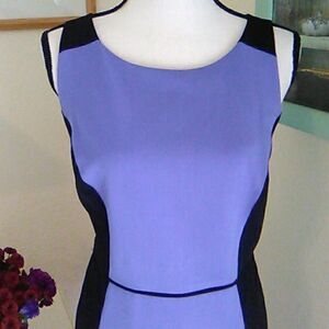 This beautiful color, almost periwinkle, goes down the front and back. Black panels on the sides. Black at waistband. Exposed zip. Fully lined. Straight skirt with back vent. Size 10 measures 40 at chest, 31 at waist, 40 at hips, 38 long from shoulder to hem. This is a beauty.