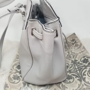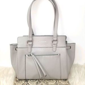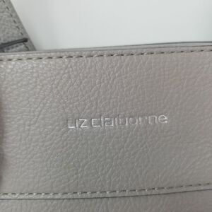 VERY GOOD USED CONDITION. Liz Claiborne. Gray faux leather. Approximate measurements are 16" x 10" x 4". Handle is approximately 22" and is not adjustable. Very pretty bag.