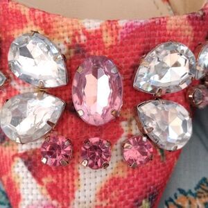 So fancy! Woven floral fabric uppers. Poppies? Pointy toe. Front is embellished with set "jewels" in pink and clear. Short covered heel. Very little wear, excellent condition. Size 6.5 measures 3.25 wide, 10.25 to end of pointy toe. These are princess shoes, you'll feel royal.